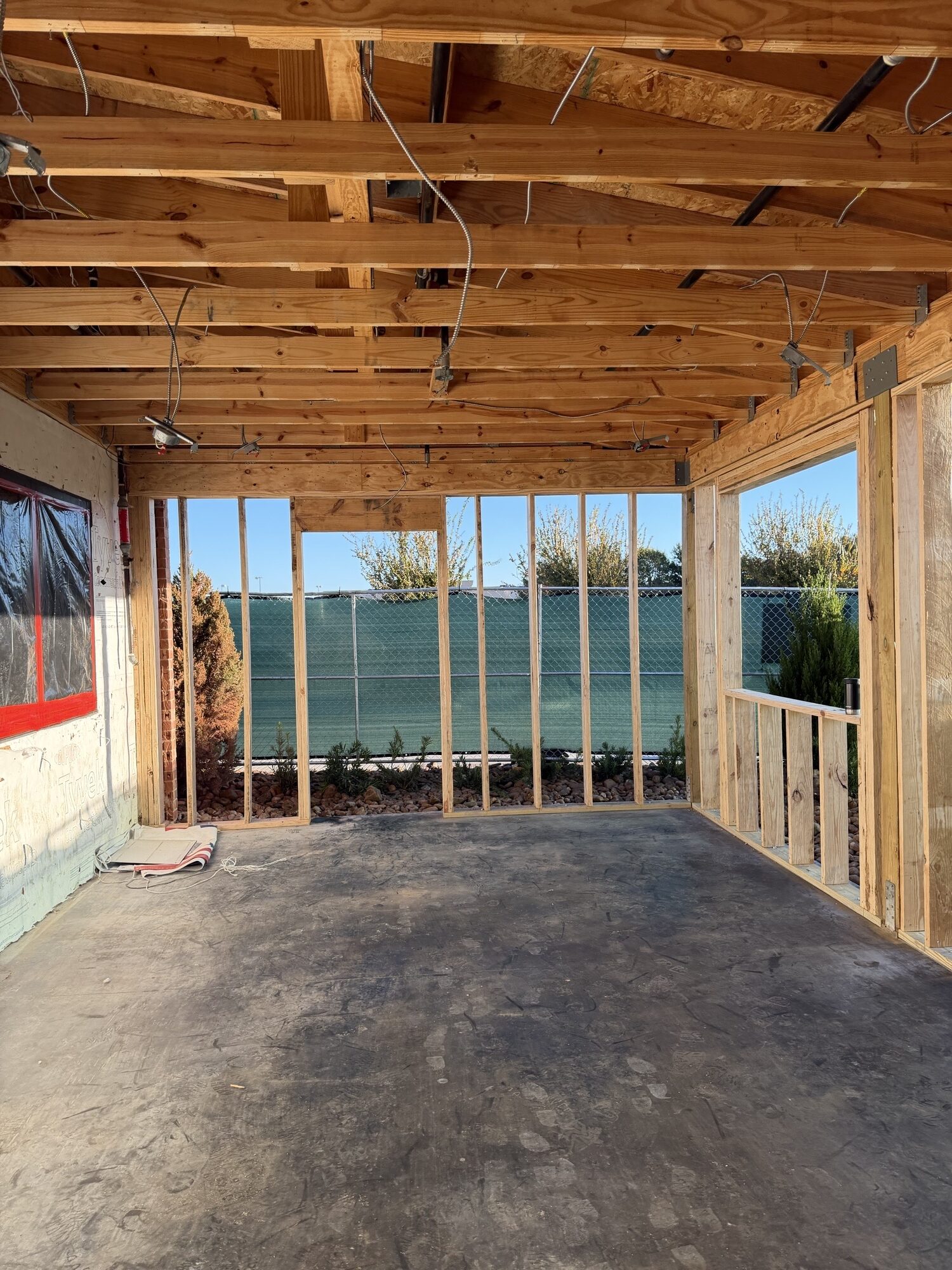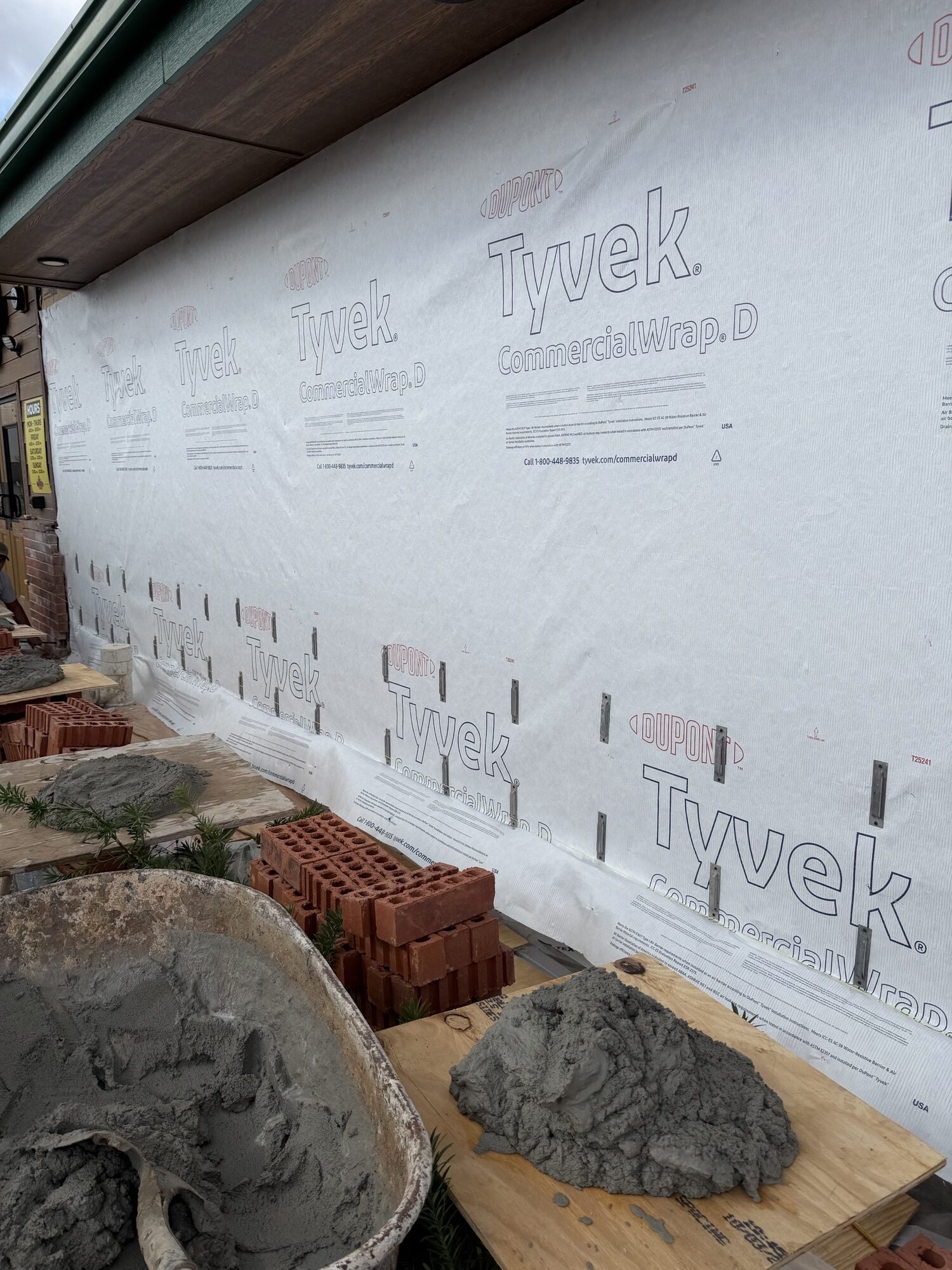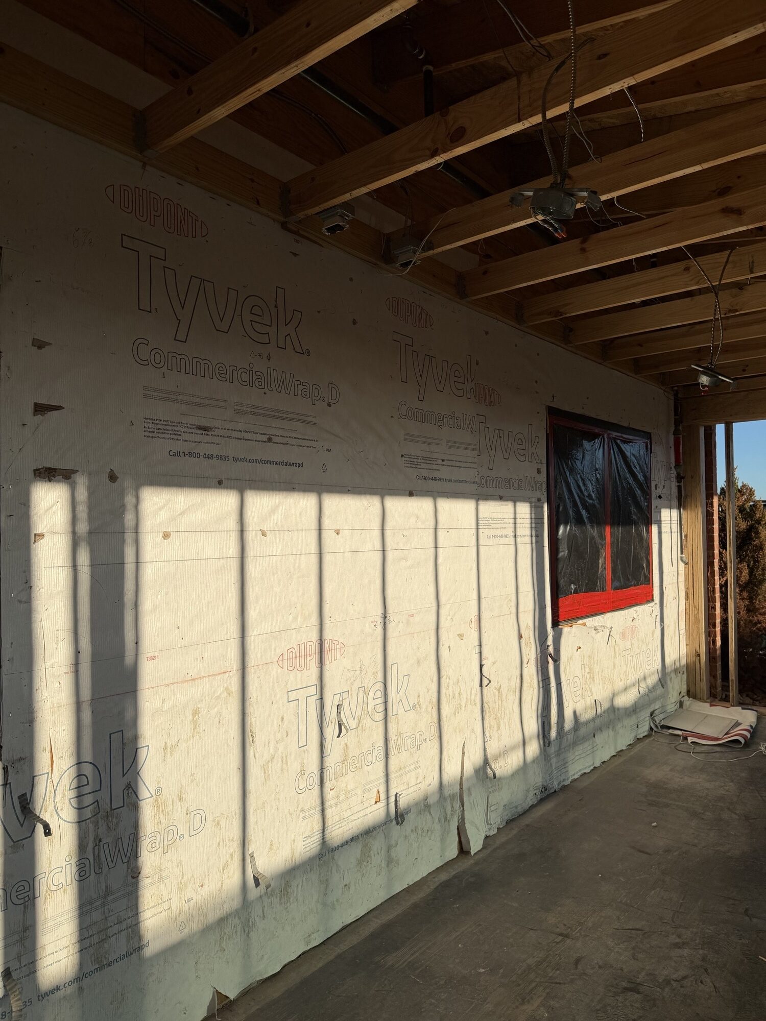 The scope began with demolition of existing ceiling and brick elements, followed by structural framing of new walls, doors, windows, and a widened main walk-through to enhance guest flow. A pony wall and structural ledger were installed and approved by inspection. All exterior sheathing was completed using a 6-12 nailing pattern, wrapped with Tyvek, and insulated at both walls and ceilings. Brick ties and rollock masonry detailing were added to ensure durability and long-term performance.