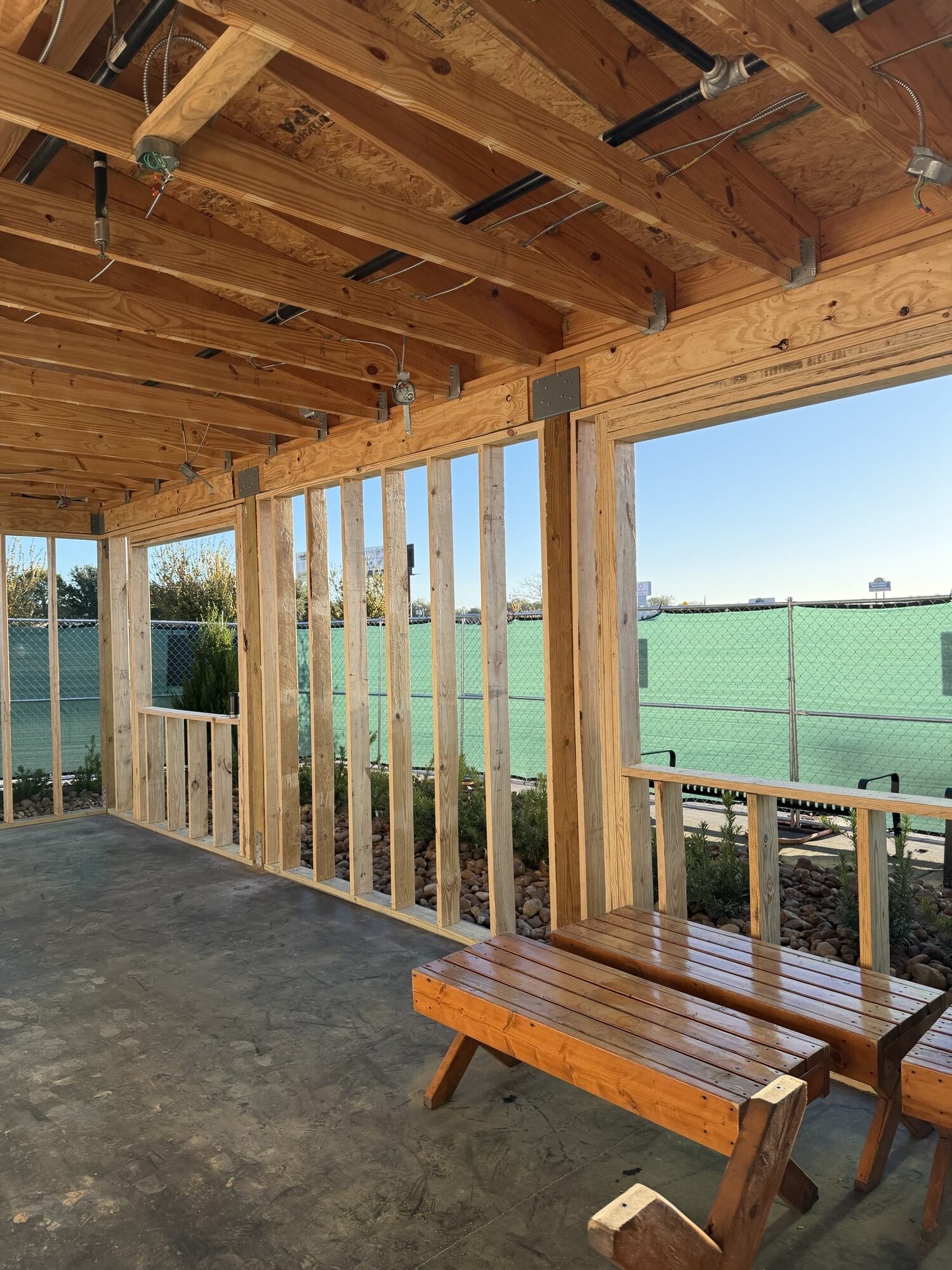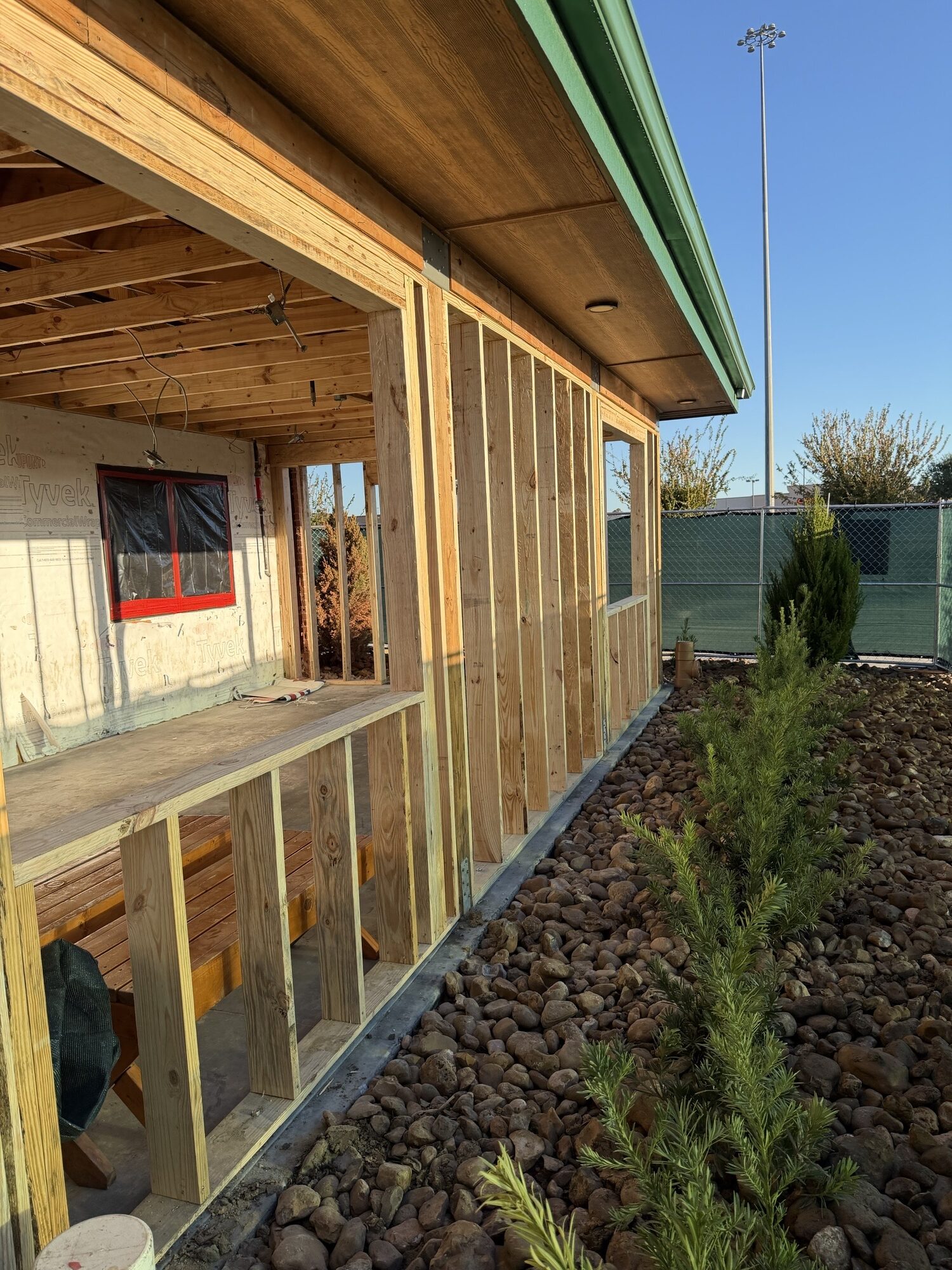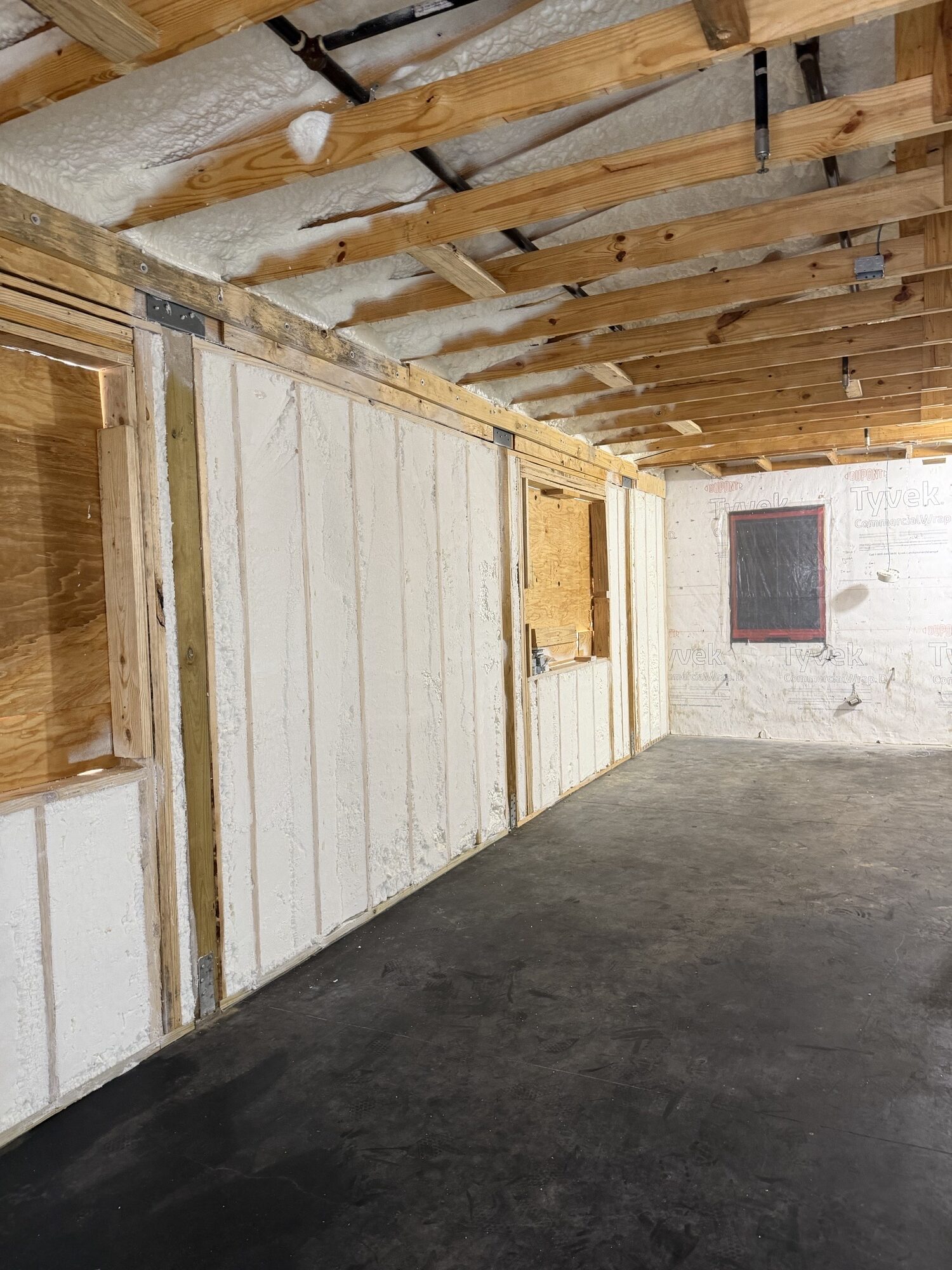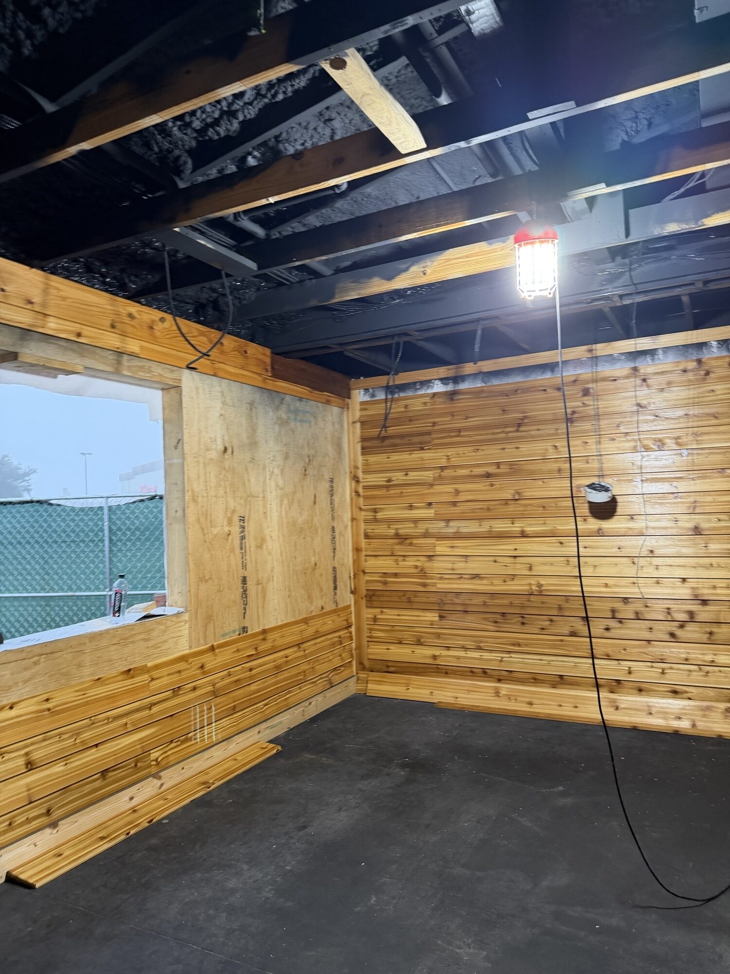 The scope began with demolition of existing ceiling and brick elements, followed by structural framing of new walls, doors, windows, and a widened main walk-through to enhance guest flow. A pony wall and structural ledger were installed and approved by inspection. All exterior sheathing was completed using a 6-12 nailing pattern, wrapped with Tyvek, and insulated at both walls and ceilings. Brick ties and rollock masonry detailing were added to ensure durability and long-term performance.