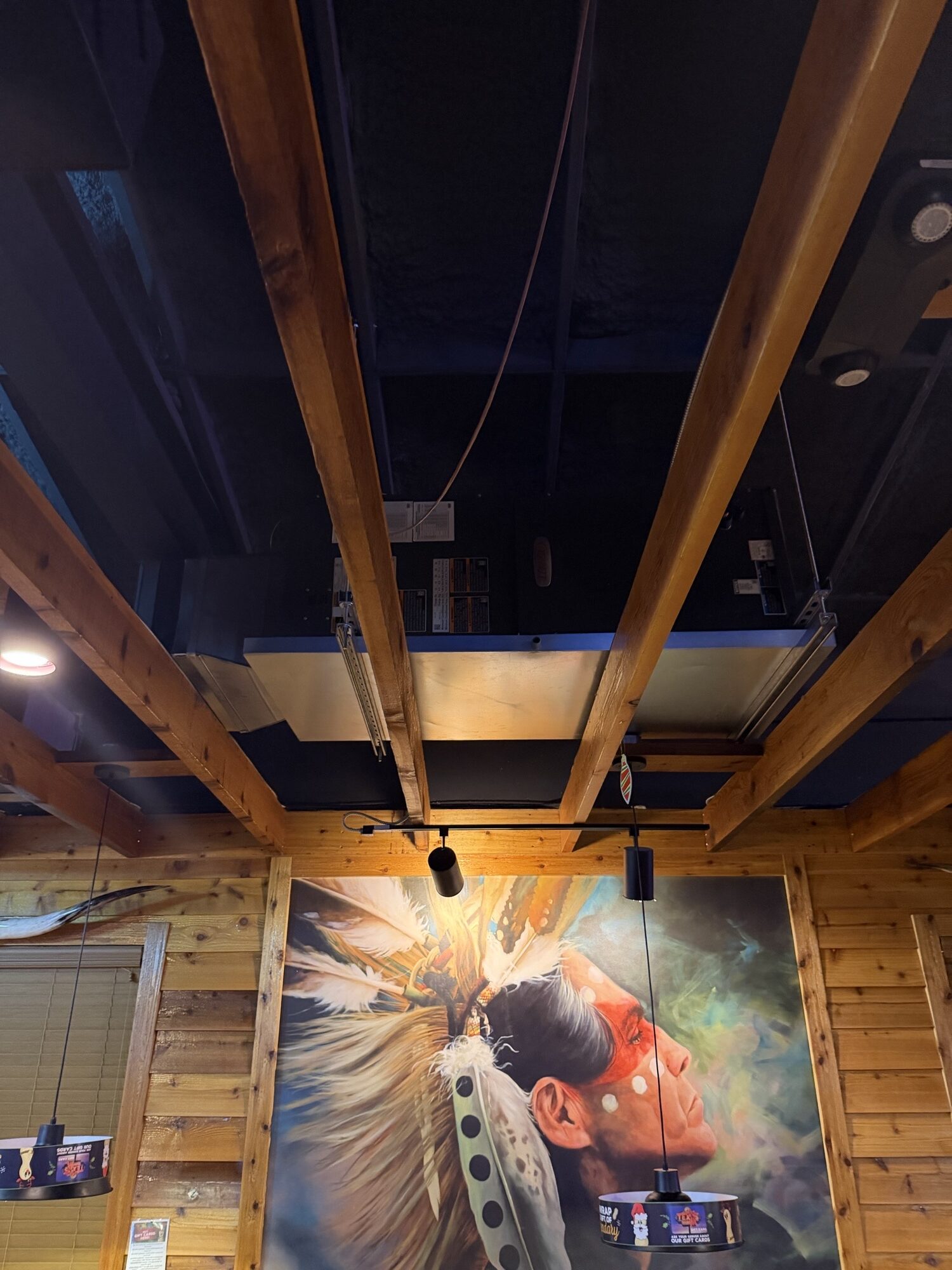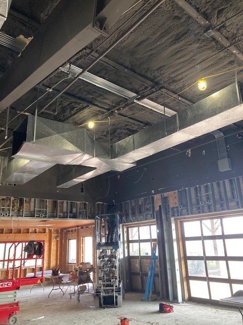 Mechanical, electrical, and plumbing systems were fully incorporated into the dining room expansion. Plumbing work included exposing the storm drain and tying in a new downspout connection. HVAC installation involved roof curb integration, line set penetrations, brazing and charging the unit, condensate pump setup, and routing of thermostat and sensor wiring. Fire suppression was tied into the existing main line, tested, and brought online to meet all safety requirements.