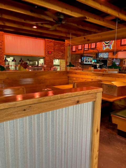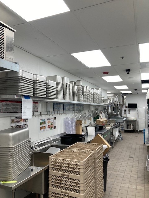 Inside, progress moved quickly across both the Front of House (FOH) and Back of House (BOH). The crew installed drywall in the mechanical room, HVAC finishes, and fire suppression systems, ensuring the restaurant meets safety and efficiency standards. FOH lighting finishes, emergency and exit lighting, restroom partitions, and mural drywall all came together to create the polished look that guests will enjoy. In the BOH, our electricians pulled wire and KEQ connections while platform flooring, ceiling finishes, and refrigeration line sets prepared the kitchen for full operation.